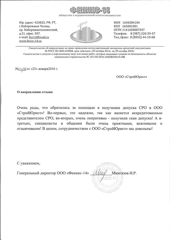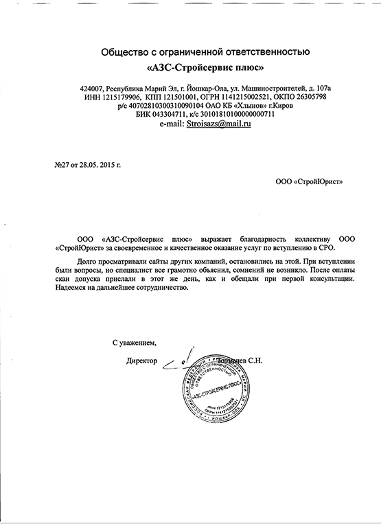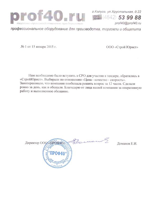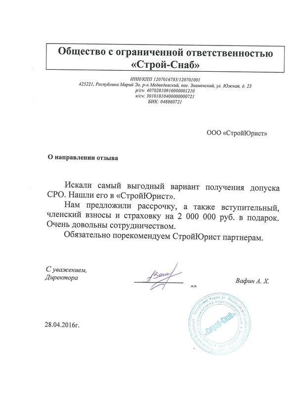 Отзывы клиентов "СтройЮрист" по вступлению в СРО в Лобне
