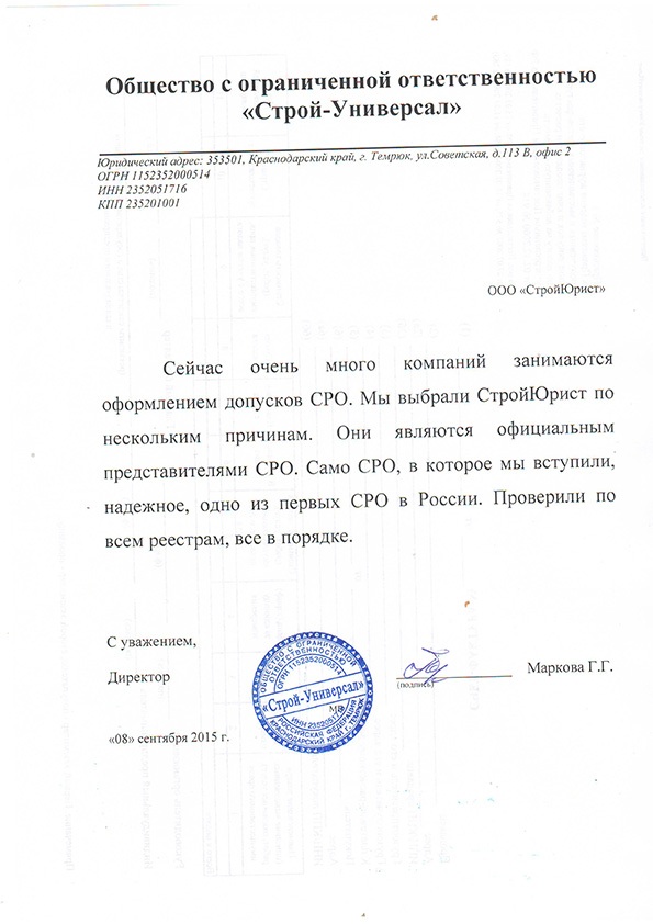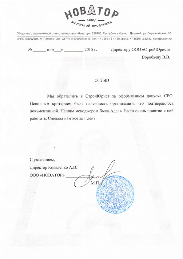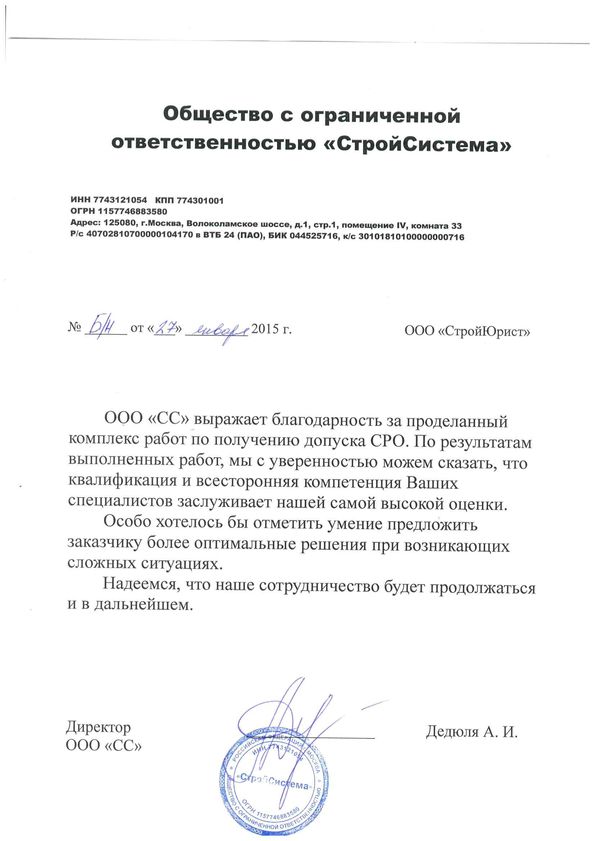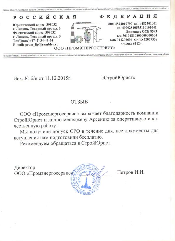 Отзывы клиентов "СтройЮрист" по вступлению в СРО в Лобне