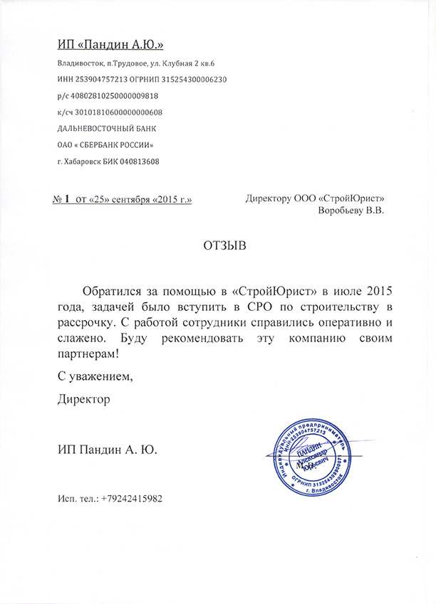 Отзывы клиентов "СтройЮрист" по вступлению в СРО в Лобне