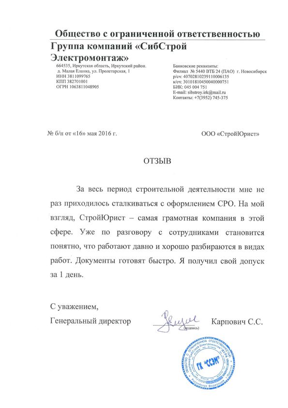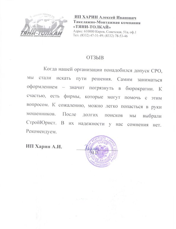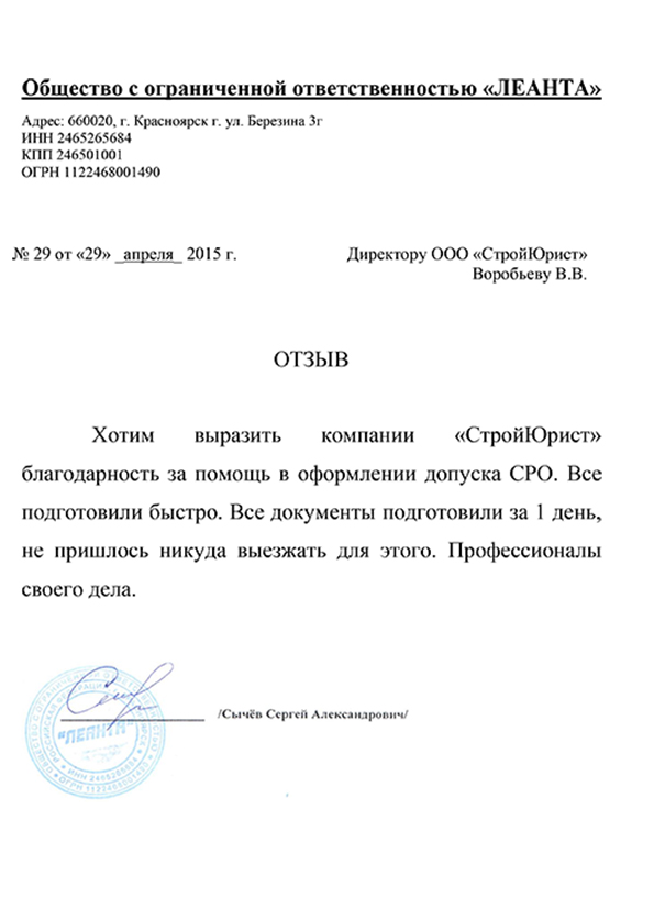 Отзывы клиентов "СтройЮрист" по вступлению в СРО в Лобне