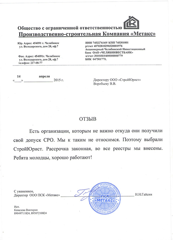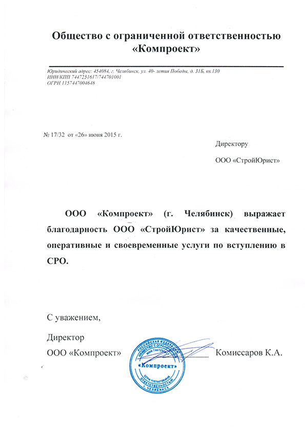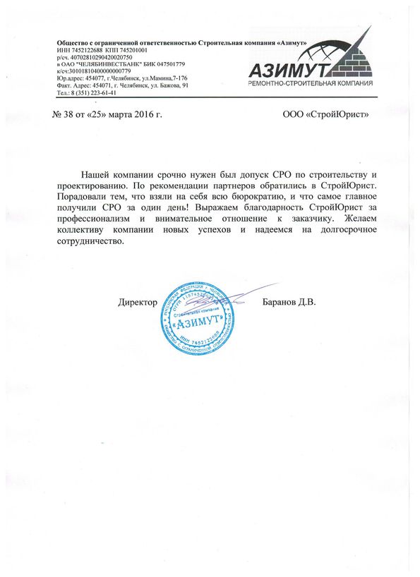 Отзывы клиентов "СтройЮрист" по вступлению в СРО в Лобне