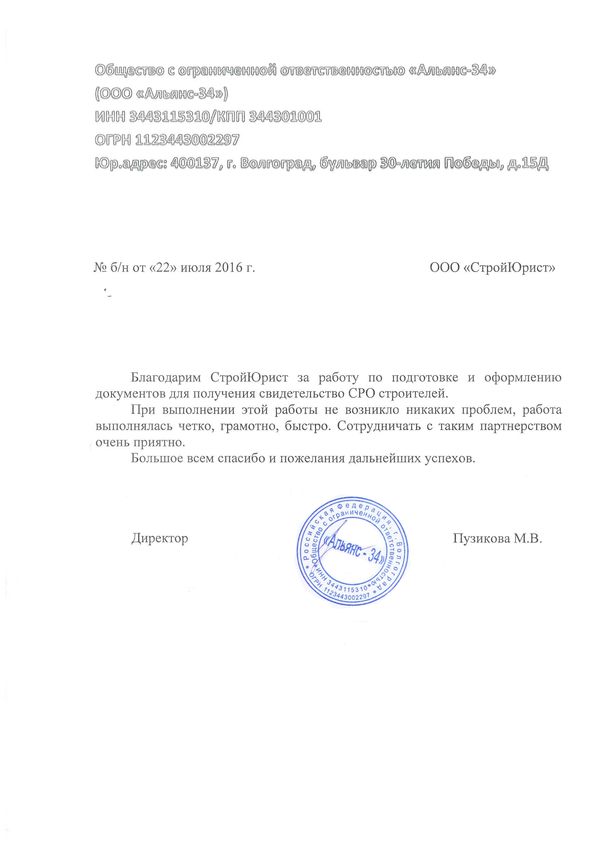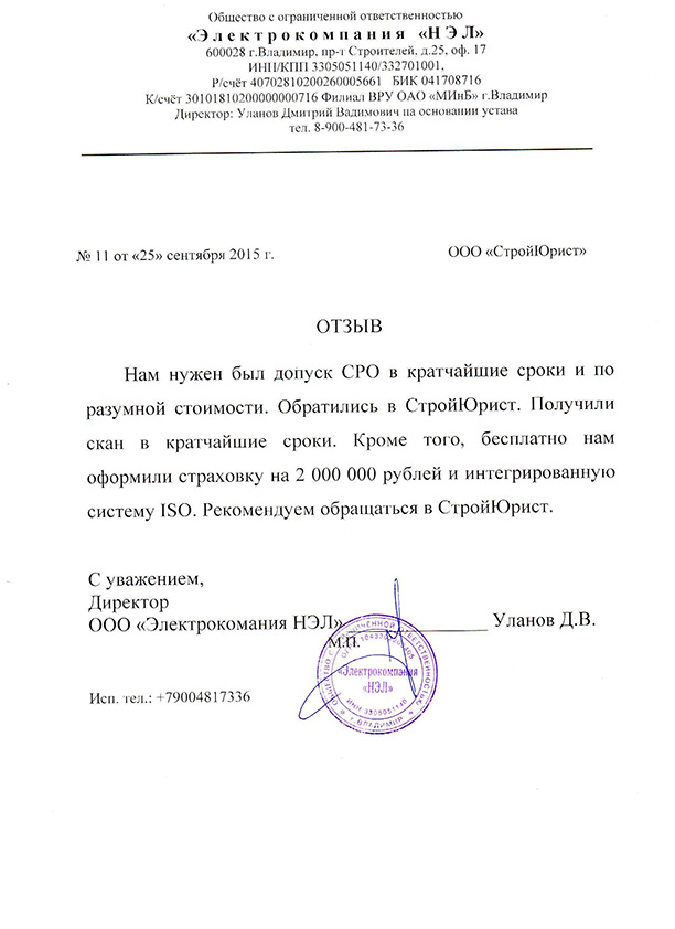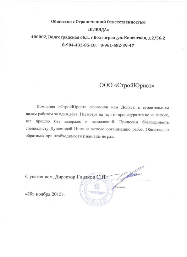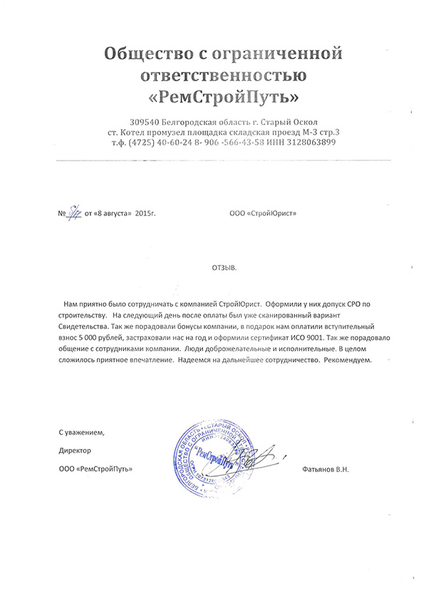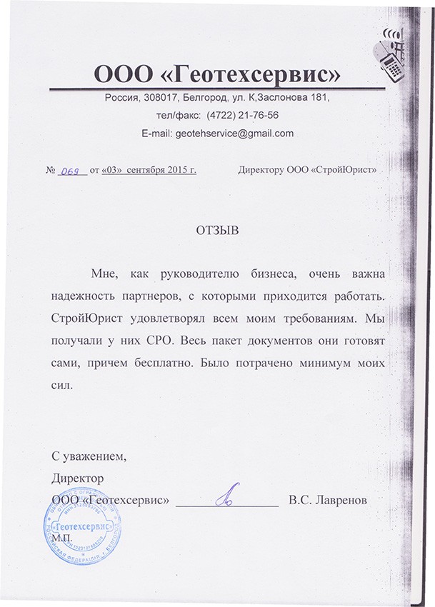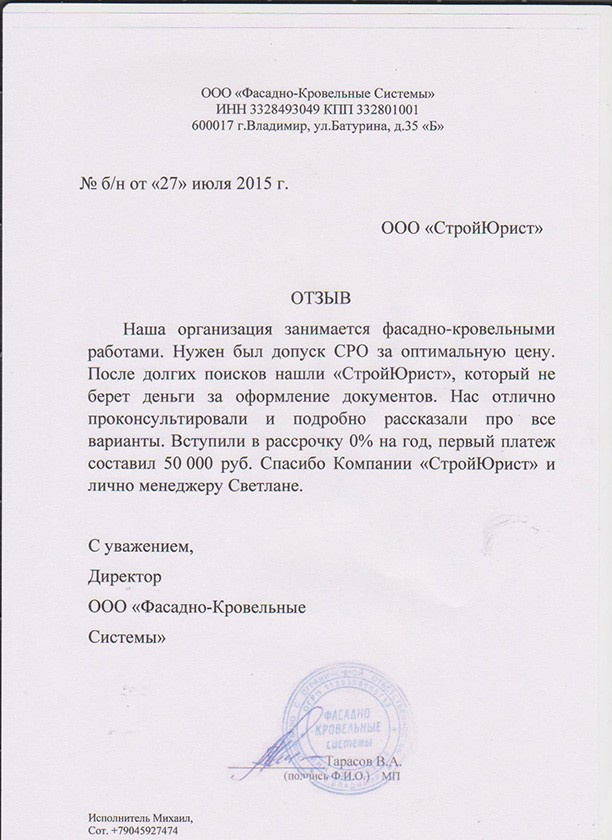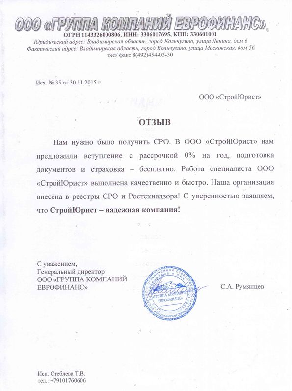 Отзывы клиентов "СтройЮрист" по вступлению в СРО в Лобне